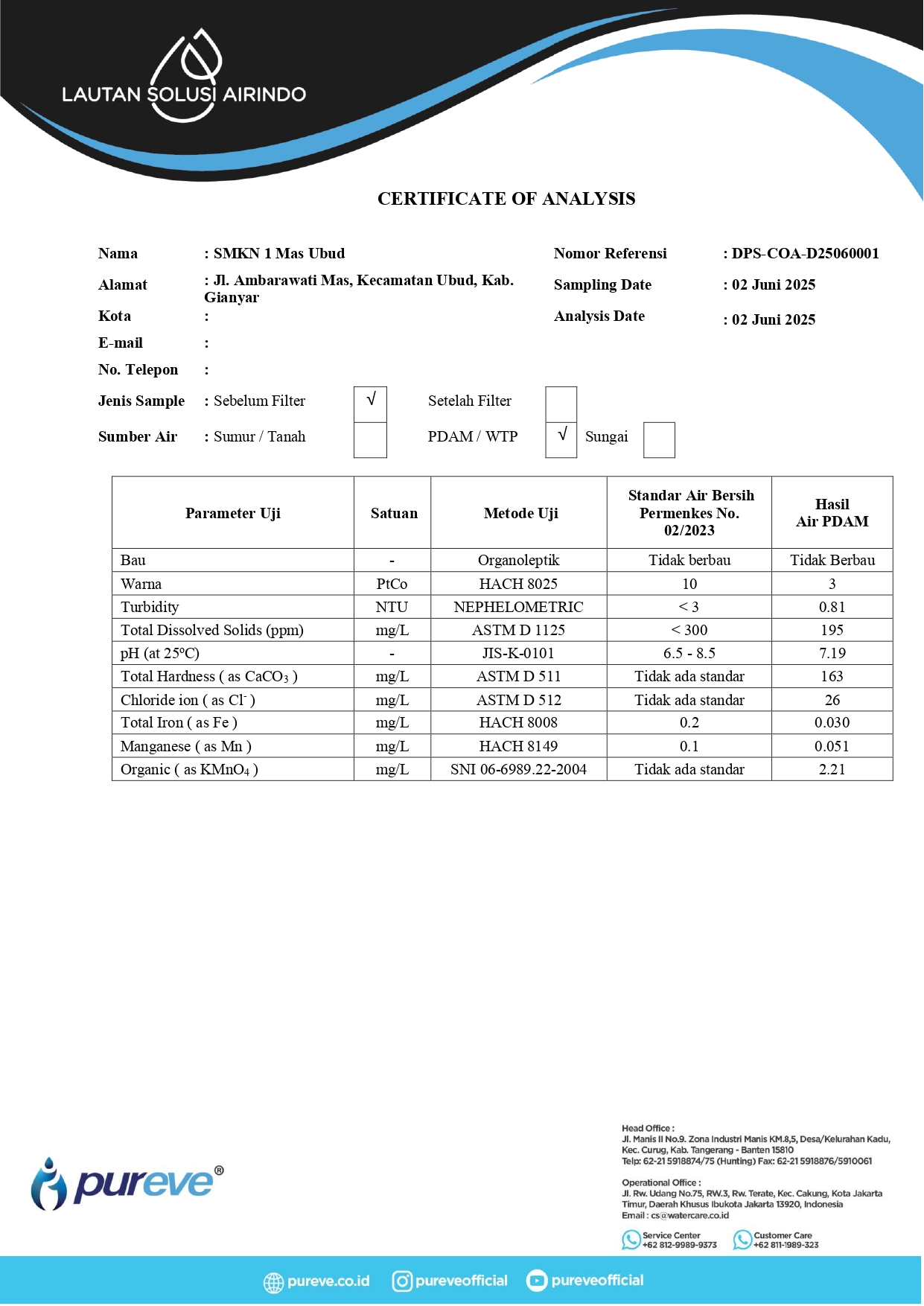 Untuk memastikan keamanan bagi seluruh warga sekolah, pihak SMKN 1 Mas Ubud telah melakukan uji kelayakan air minum yang disediakan. Berdasarkan hasi ujil laboratorium, kualitas air “STIKMAS SPRINGS” telah memenuhi standar fisika, kimia, dan mikrobiologi sesuai Peraturan Menteri Kesehatan No. 2 Tahun 2023 tentang Standar Air Minum.
