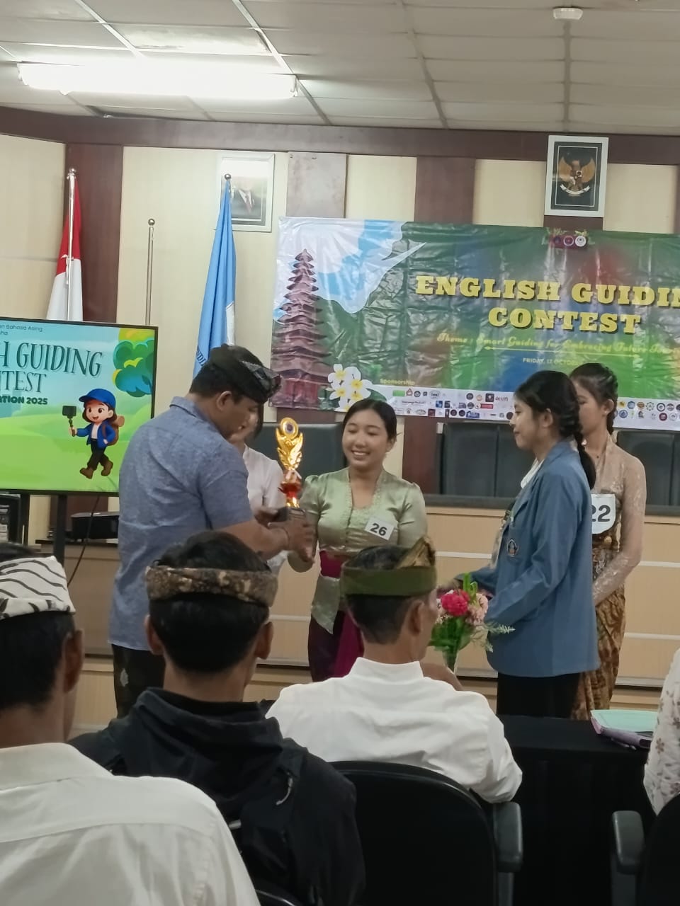 Prestasi membanggakan kembali diraih oleh salah satu siswi SMK Negeri 1 Mas Ubud, Bintang Okta Anggradewi (@bintang_oktaa16) yang berhasil meraih Juara 2 dalam ajang English Guiding Contest pada 17 Oktober 2025. Lomba ini merupakan bagian dari rangkaian acara ulang tahun Jurusan Bahasa Asing Universitas Pendidikan Ganesha (Undiksha) yang bertajuk “Inspiration 2025”.